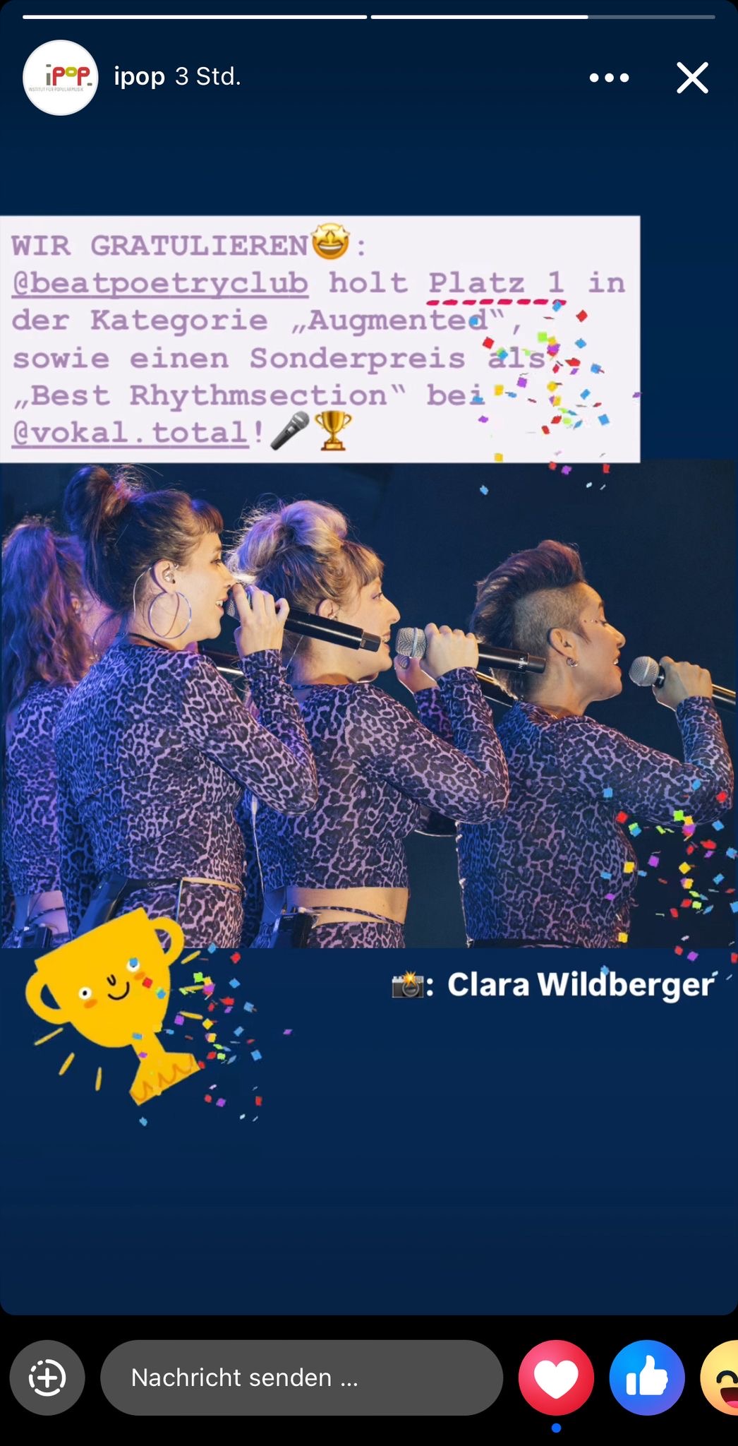 Mit überzeugender Performance, starken Solovocals, ausgefeilten & einzigartigen Sound und Arrangements und einer beeindruckenden Bühnenshow gewinnt Beat Poetry Club den 1. Platz und zusätzlich einen Sonderpreis als „beste Rhythmsection“.